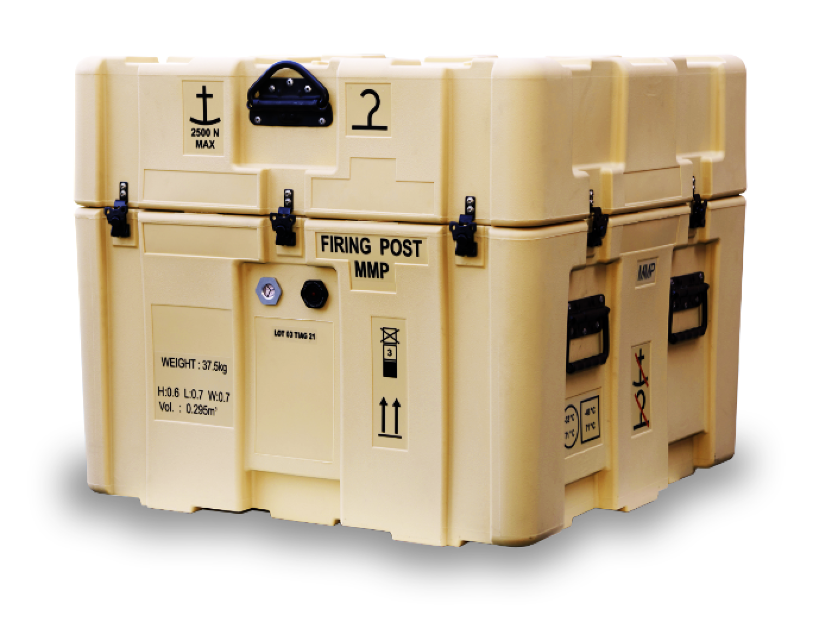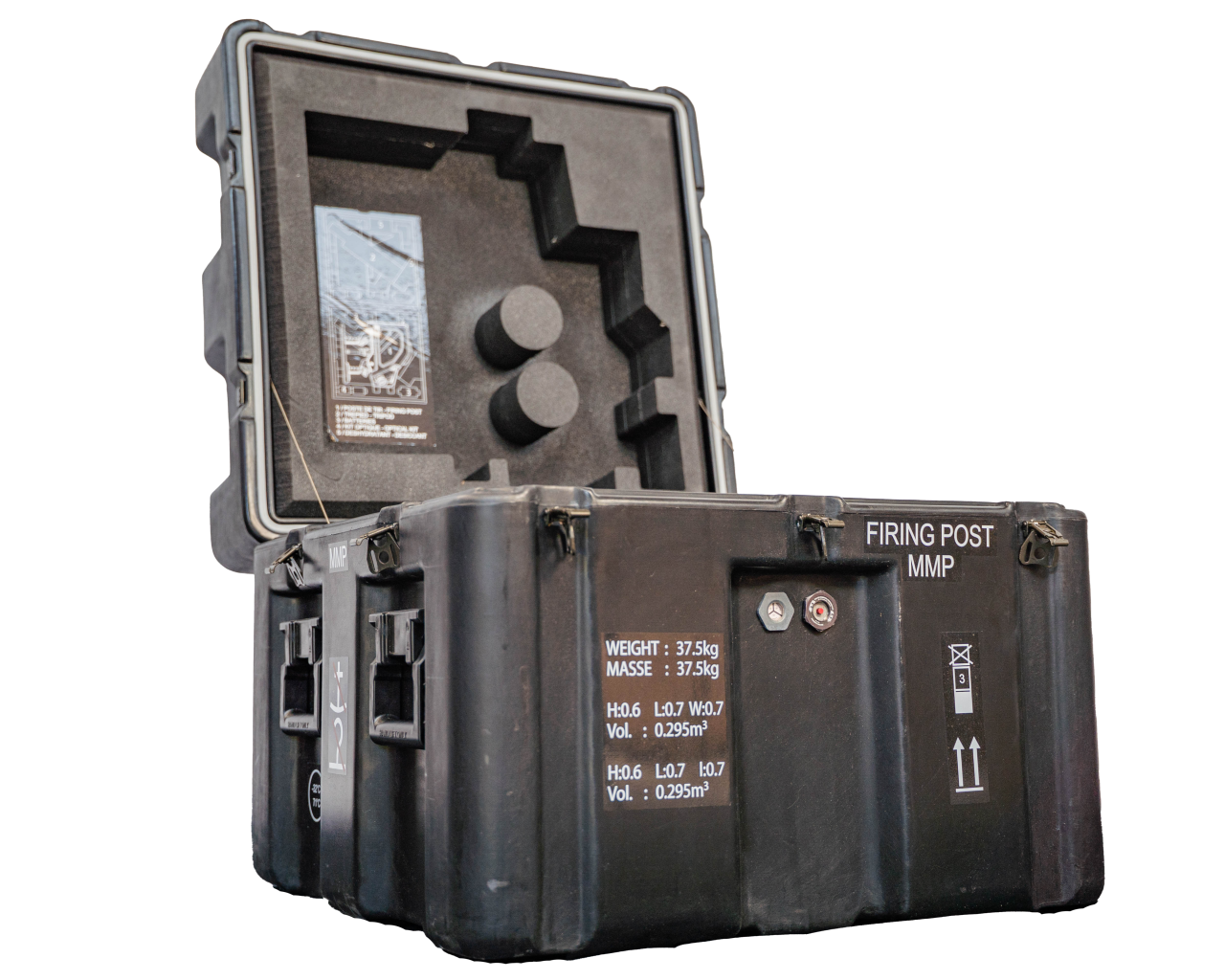 MRBM firing post station container is delivered by TIAG to customer as shown in picture: handles, specific labels, opening and closing systems, internal bumpers and valve.